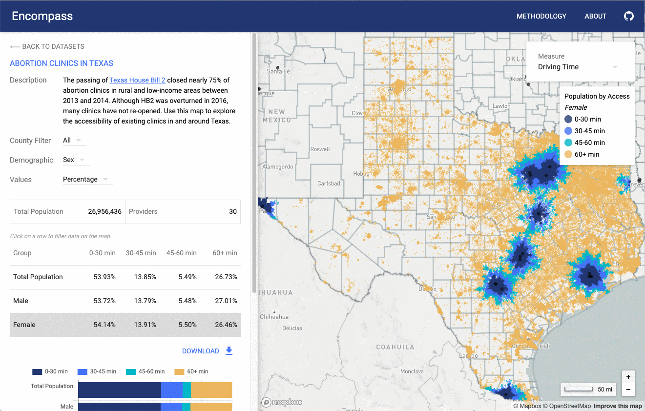 The resulting application is named Encompass, and serves as an analytics and mapping tool that equips policymakers, researchers, and consumer advocates with data to make informed policy and implementation decisions to improve the equity and accessibility of social services to disadvantaged populations.